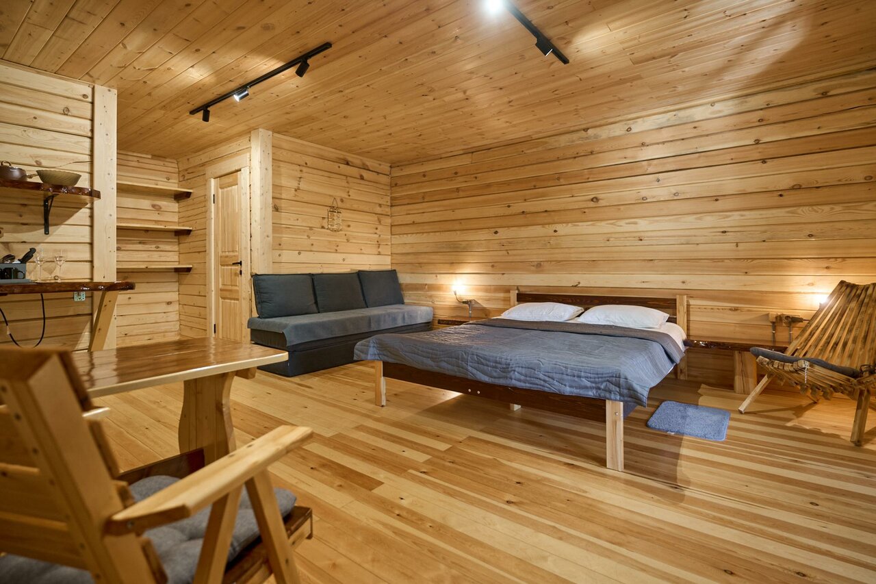 Фото и описание полностью соответствуют действительности. Всё новое, красивое, функциональное. Очень хорошо, что в номере есть мощный обогреватель, ночи были холодные, без него было бы холодно. Прекрасное французское окно с выходом на террасу. На террасе тоже удобная мебель. Есть мангальная зона.